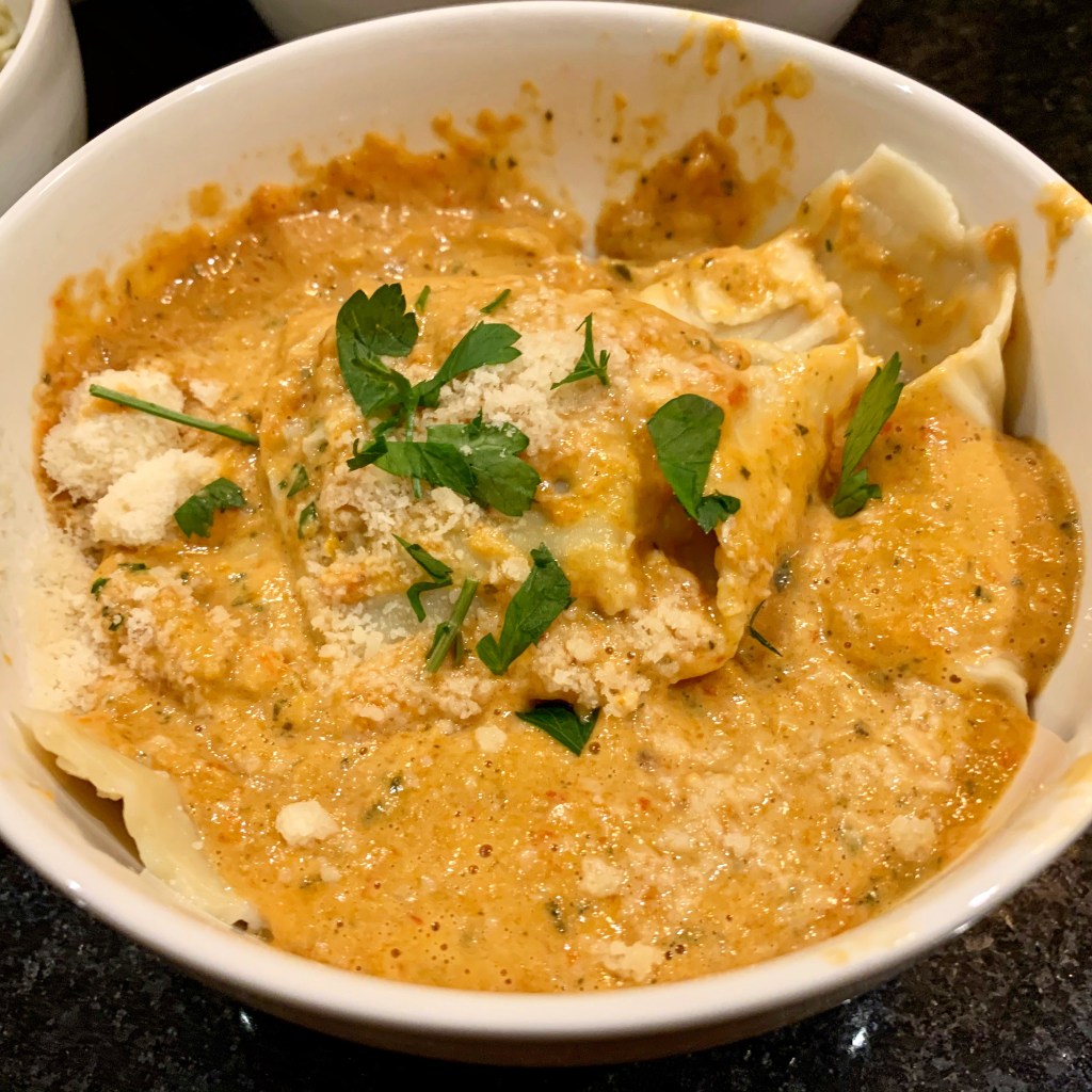 To cook, bring a large pot of salted water to a oil. Cook the ravioli for a couple of minutes until they start to float. Serve with Roasted Red Pepper sauce.