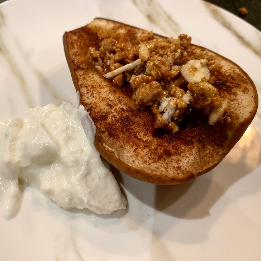 Cut pears in half, then cut a small sliver off the underside so the pears sit flat when placed upright on the baking sheet. Core out the seeds. Arrange pears, facing up, on the baking sheet. Sprinkle evenly with cinnamon.