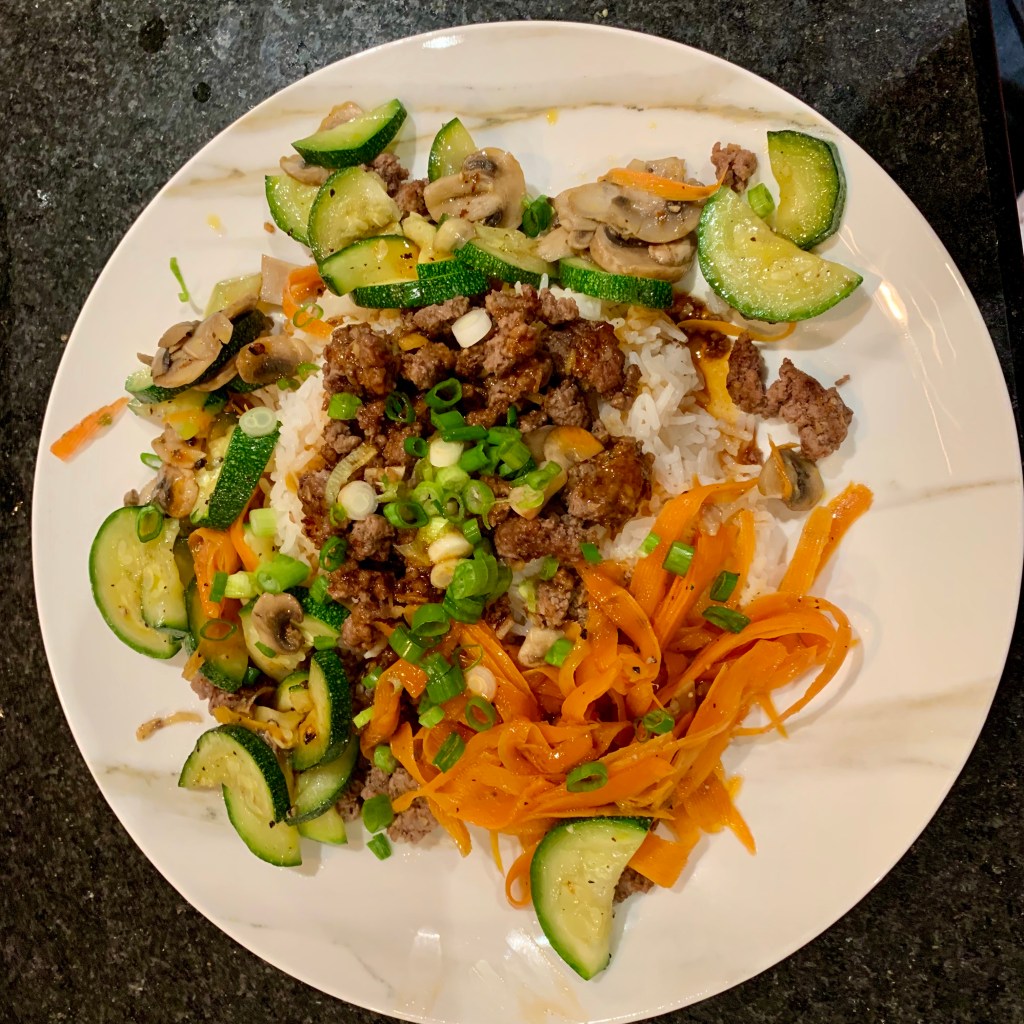 Fluff rice with a fork; divide between bowls. Arrange beef, zucchini, carrots, and mushrooms on top. Top with pickled scallion whites (draining first). Drizzle with sauce and any remaining sriracha to taste. Sprinkle with scallion greens and serve.