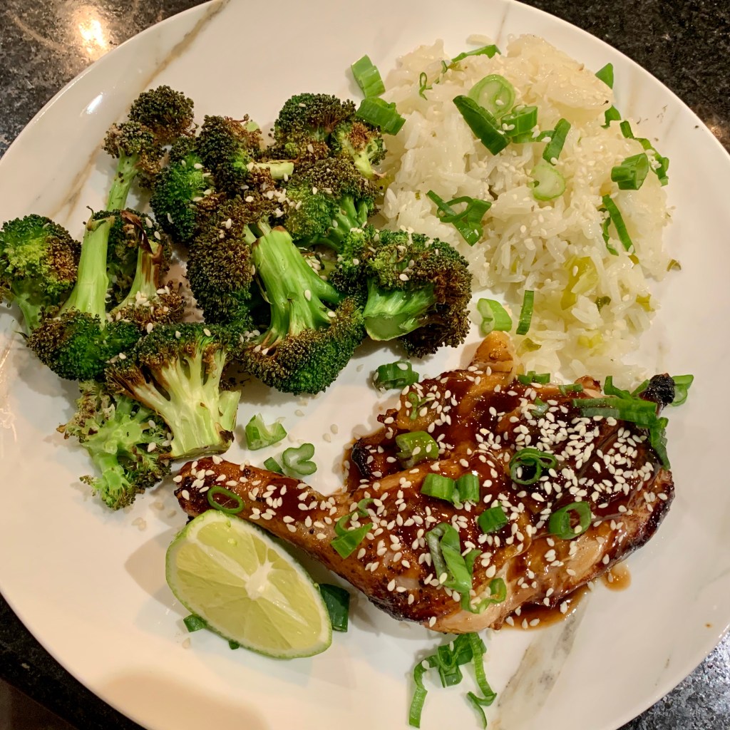 While chicken bakes, wash and dry all produce. Mince or grate garlic. Cut broccoli florets into bite-size pieces, if necessary. Trim and thinly slice scallions, separating whites from greens. Peel and mince or grate ginger. Quarter lime.