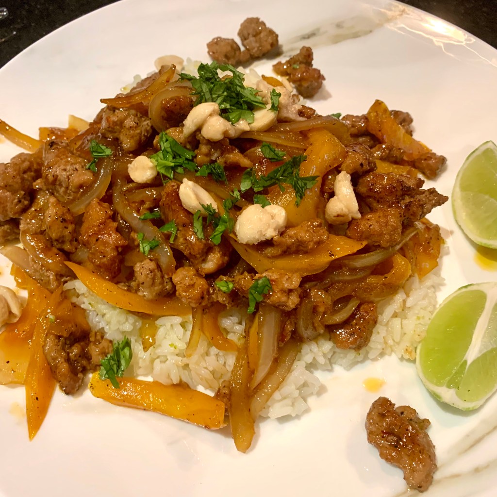 Fluff rice with a fork; stir in 1 tablespoon butter and lime zest to taste. Season with salt. Divide between bowls and top with pork mixture. Top with peanuts and cilantro. Serve with lime wedges on the side.