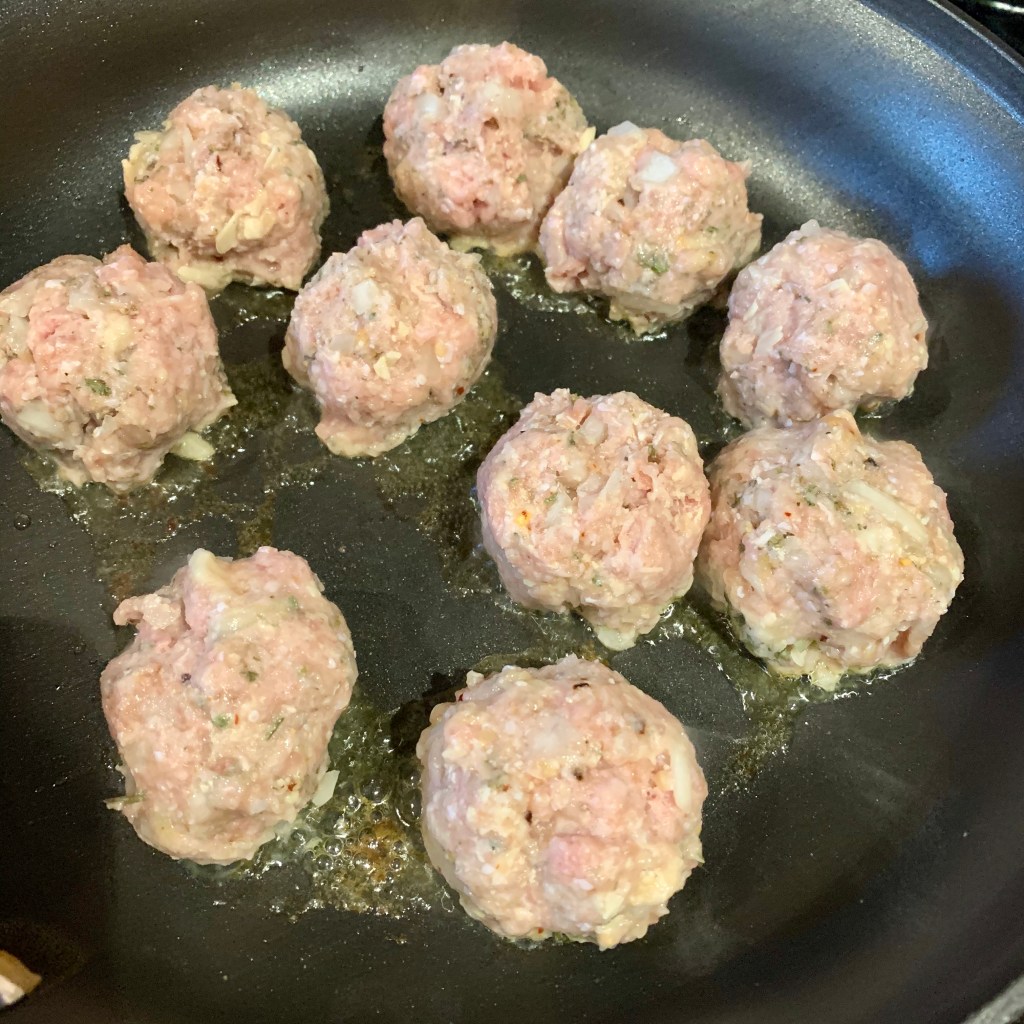 Roll the meatballs and place them on a cutting board of parchment paper (or in the glass Pyrex dishes) while the pan is preheating to medium-high heat.
