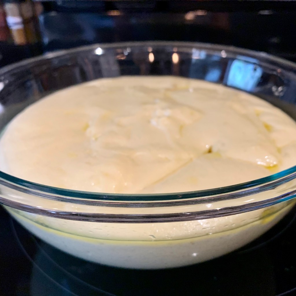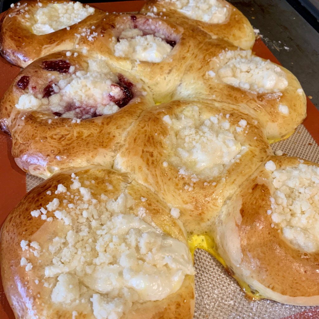 Let rise: Transfer the dough to a well-oiled bowl (I used olive oil), then cover the outside of the dough with some oil as well (I used a brush to evenly spread it). This will keep it from cracking and drying as it rises. Cover the bowl with a hand towel. It is best to set the dough in a warm place (between 80°F-90°F). I turn the oven to 250°F for 3 minutes, then turn it off and set my bowl with dough inside the oven with the oven light on. Top of the refrigerator or any other warm, draft-free place will work as well. The dough should double in size in about 30 minutes. During that time, make the cream cheese filling, streusel topping and egg wash.