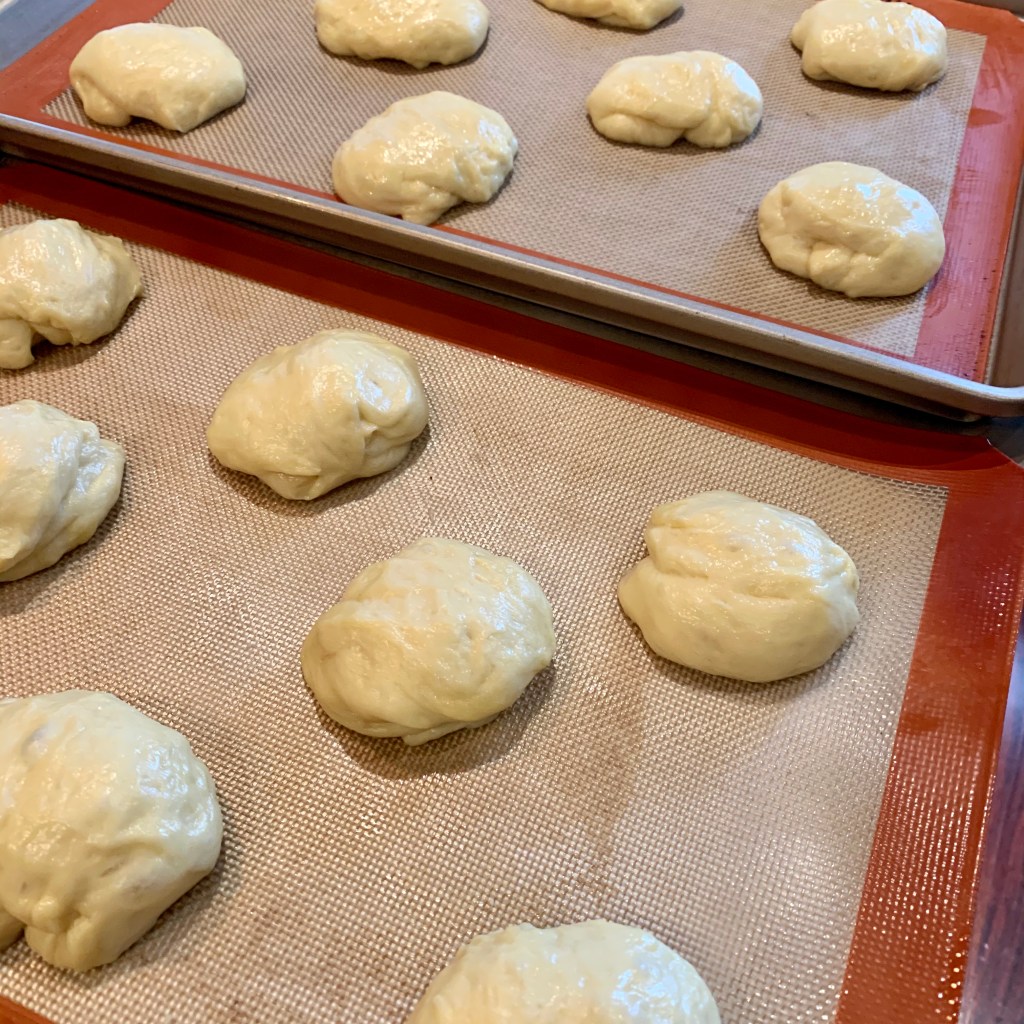 Shape each piece of dough into a ball by tucking the ends underneath itself until you get a smooth surface on top. Set the rolled danish buns on two 12″x18″ foil or parchment-lined baking sheets, evenly spacing each piece of dough with 8 buns on each baking sheet.