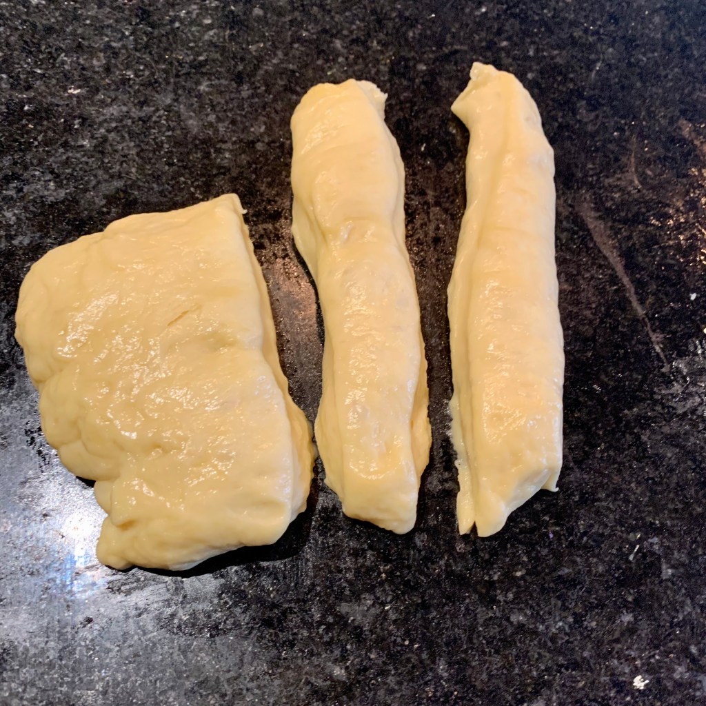Divide & shape the pastry dough. Once the dough is doubled (about 30 minutes), punch it down. Next, divide the pastry dough into 15-16 equal pieces. The most accurate way to do that is to weigh the dough, then divide the total by 16. (I shaped the dough into a long rectangle and then eye-balled it to make 16 pieces).