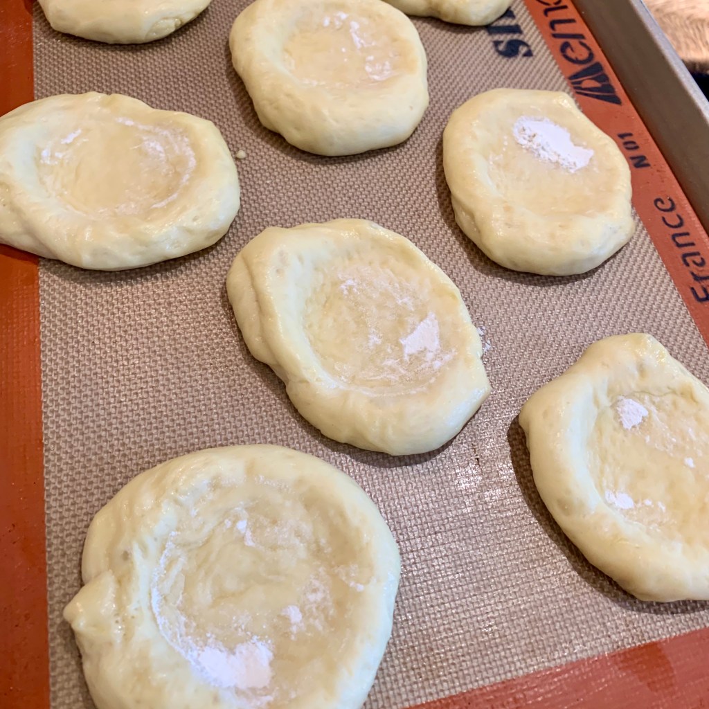 Let rest for 10 minutes, then dip the bottom of a glass or a cup into flour and press with it in the middle of each bun to form an indentation.