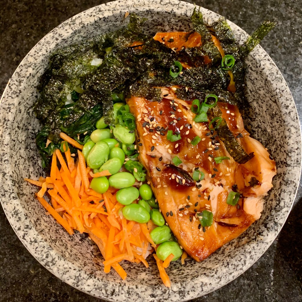 To assemble bowls, heat up cooked rice and divide between bowls. Top with salmon, spinach, carrots, edamame, avocado, sesame seeds, green onions and seaweed strips. Drizzle any remaining teriyaki sauce over bowl, if desired.