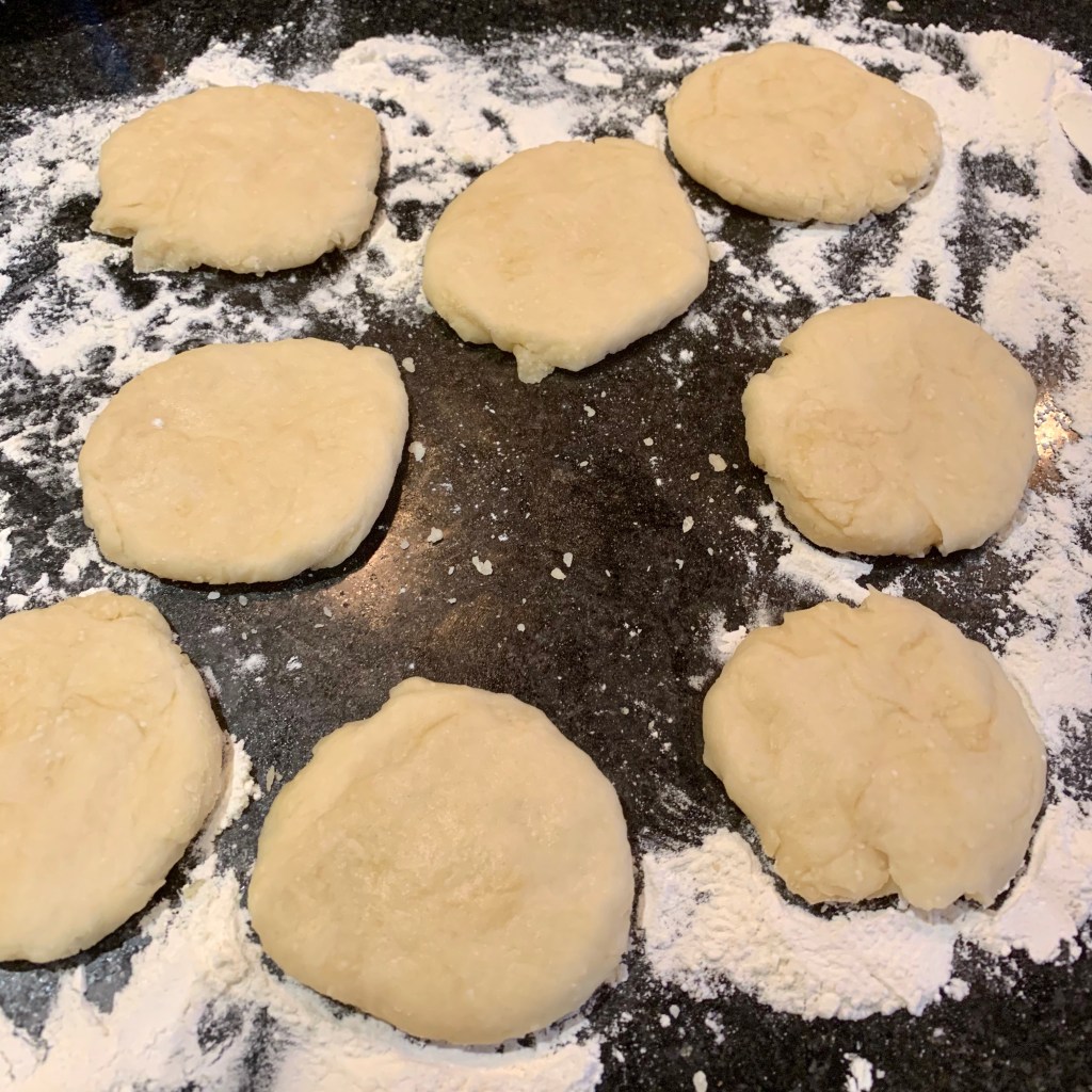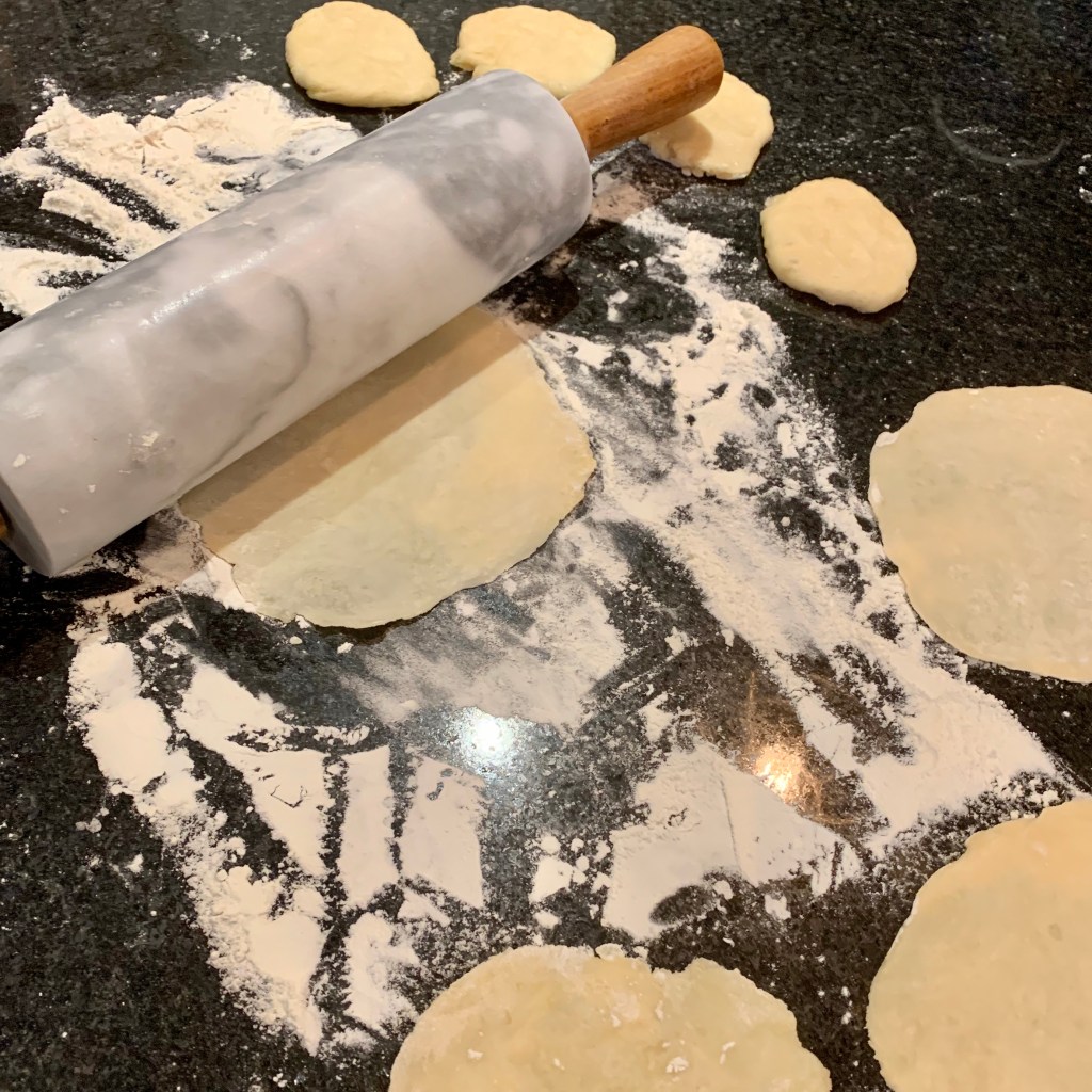 Keeping the work surface and rolling pin lightly floured, roll each dough ball into a circle about 6″ in diameter.