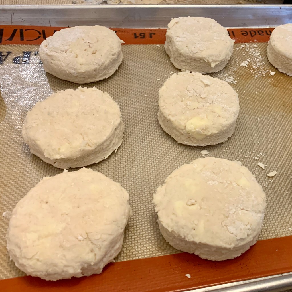 Repeat until you have gotten as many biscuits as possible and place less than 1/2″ apart on baking sheet.