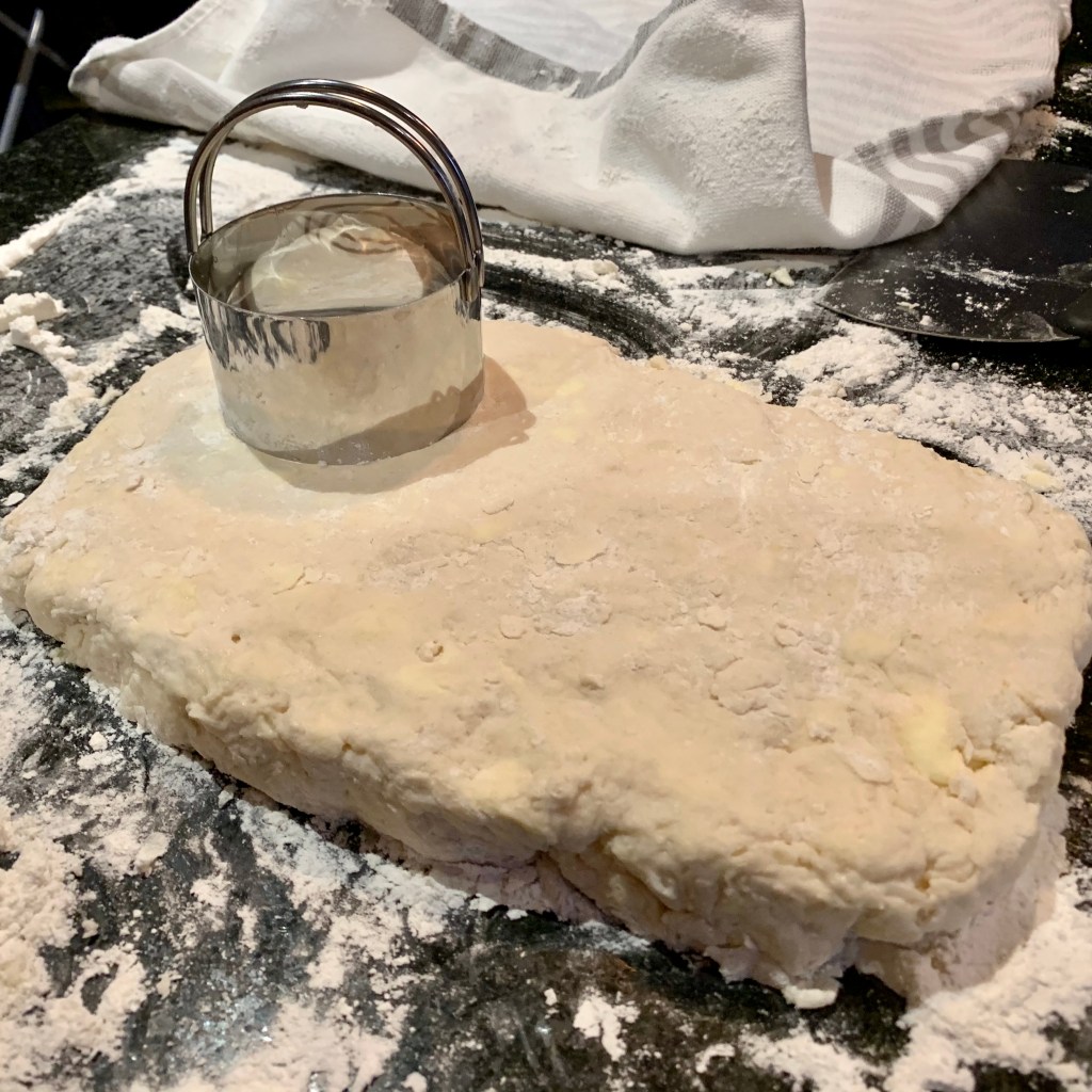 Use your hands (do not use a rolling pin) to flatten the dough to 1″ thick. Lightly dust a 2 3/4 inch round biscuit cutter with flour.