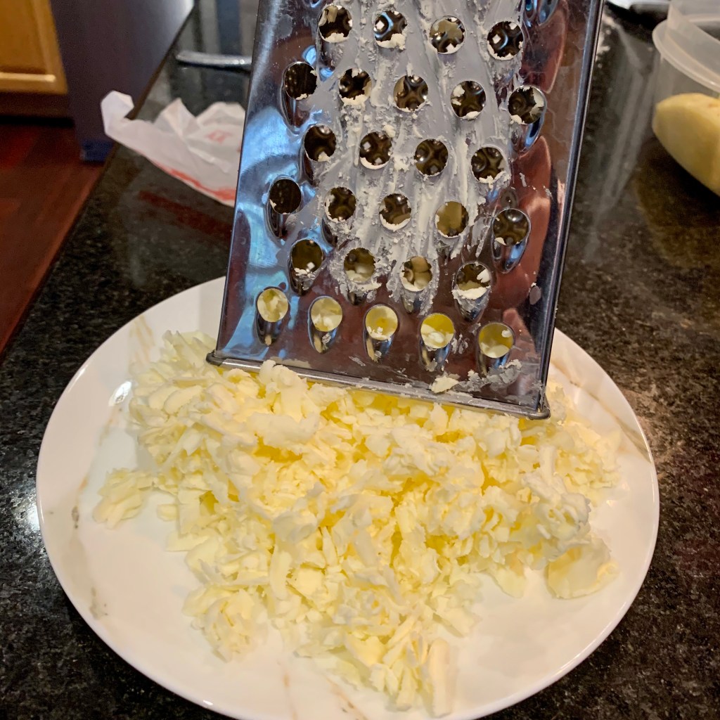 Remove your butter from the freezer. Using a box grater, shred the butter into small pieces.