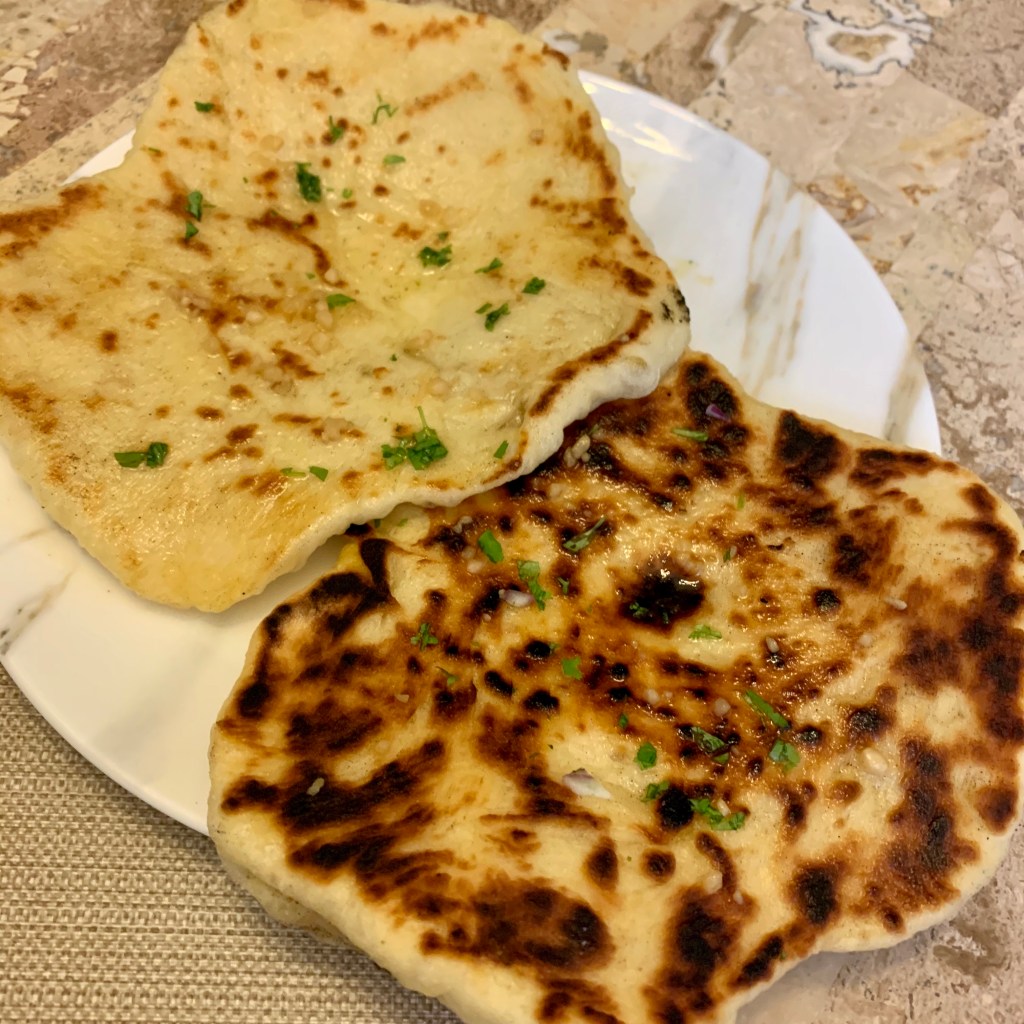 Heat a large cast-iron skillet or heavy saute pan over medium-high heat. Add a piece of the rolled-out dough to the pan and cook for 1 minute, or until the dough begins to bubble and the bottom turns lightly golden. Flip the dough and cook on the second side for 30-60 seconds, or until the bottom is golden. Then transfer the naan to a separate plate. (I sometimes add more butter to the naan once it’s removed from the heat so it melts into the bread.) Cover with a towel. Repeat with remaining dough until all of the naan pieces are cooked.